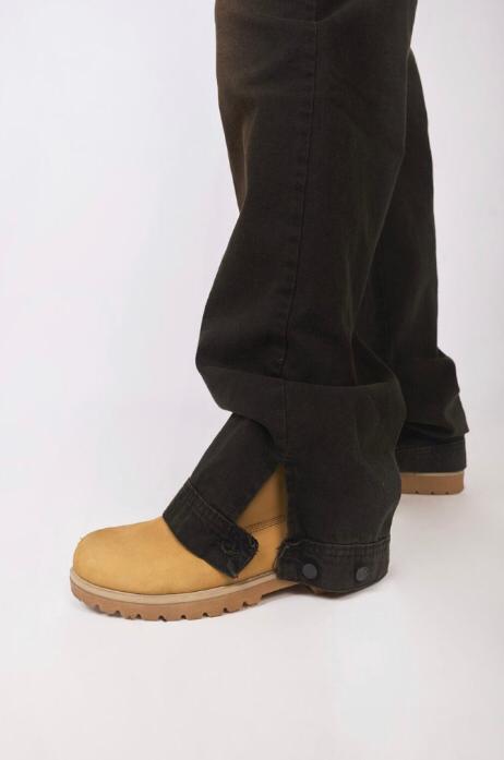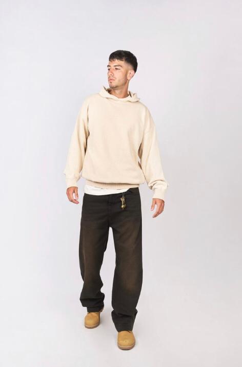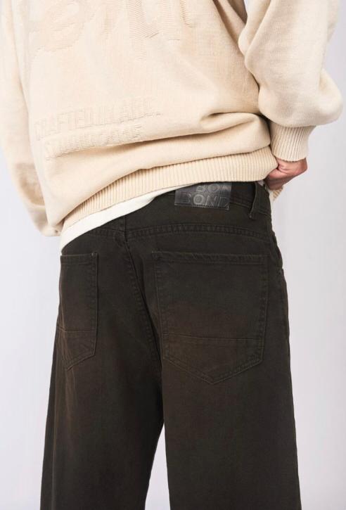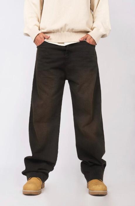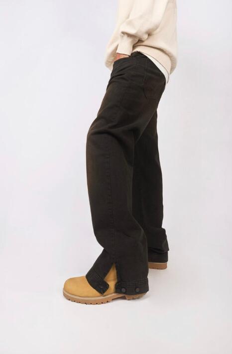 denim negro rigido, con costuras negras, calce baggy y botamanga en tobillo con botones para regular. Tiene un lavado artesanal matizado en tonos tierra con luces y bigotes en delantero. Avios negro y badana monograma bond en color negro.