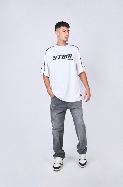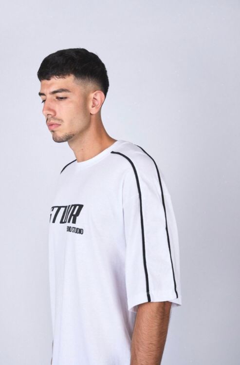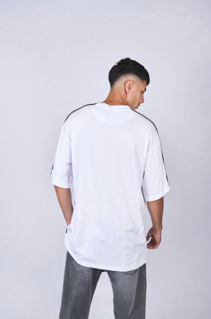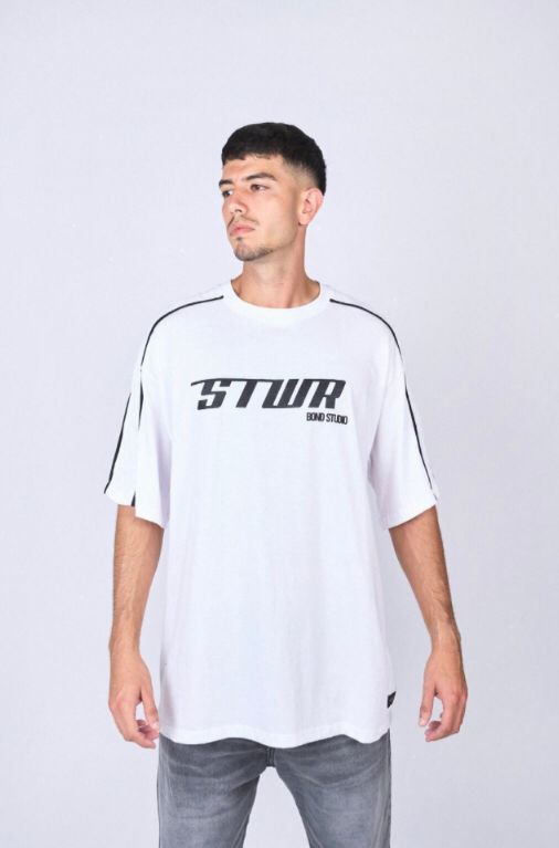 Calce oversize, con recorte en mangas terminado de tela base a contratono. Tiene estampa tipografica BOND en delantero y etiqueta institucional en el lateral izquierdo a contratono.