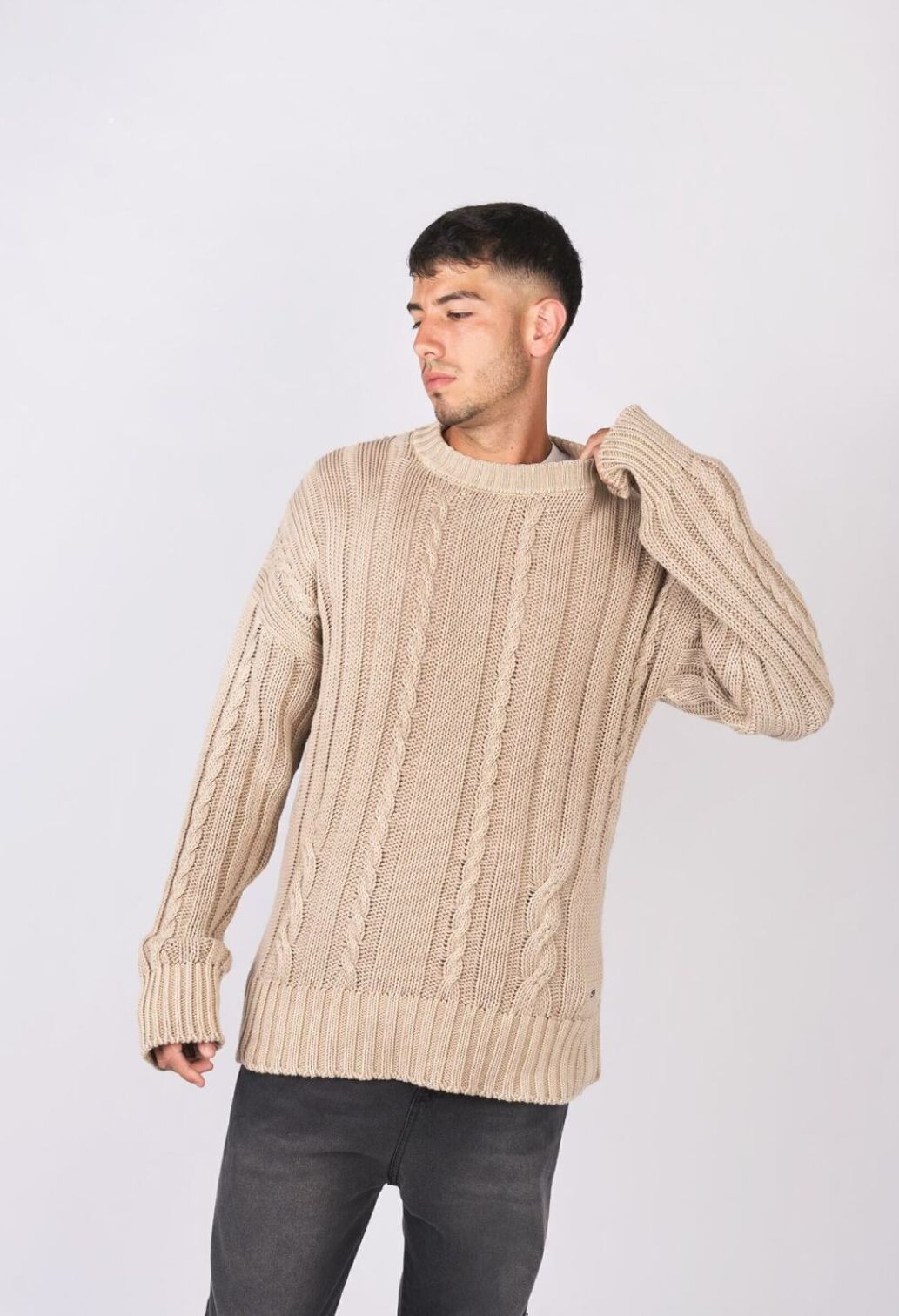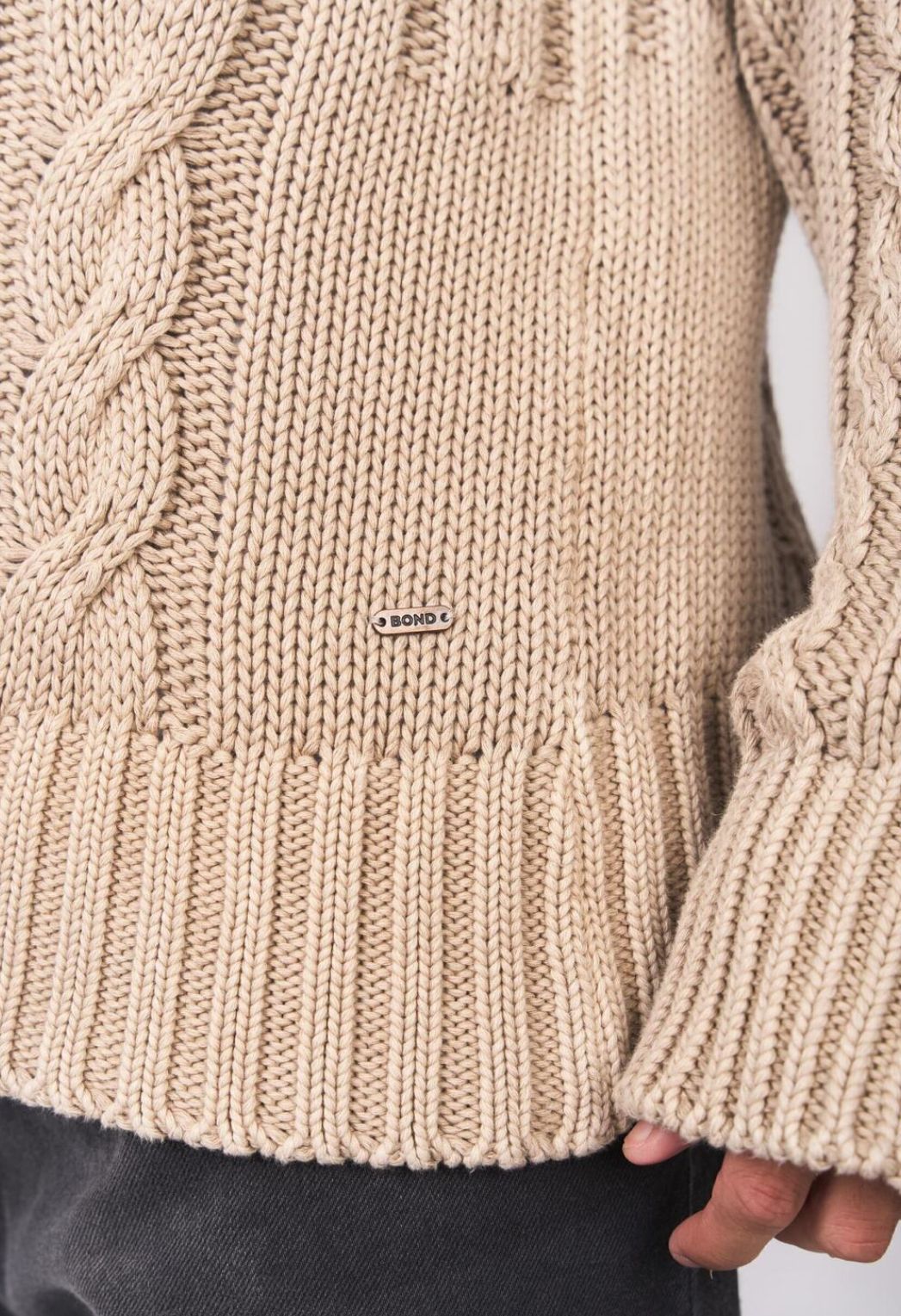 Hilado premium, tejido con punto ingles y diseño de ochos. Cuello, puños y cintura tejidos en ribb.