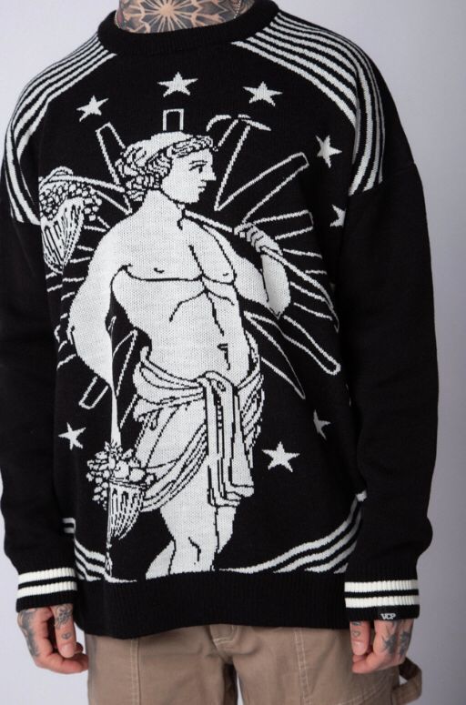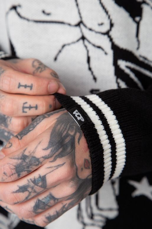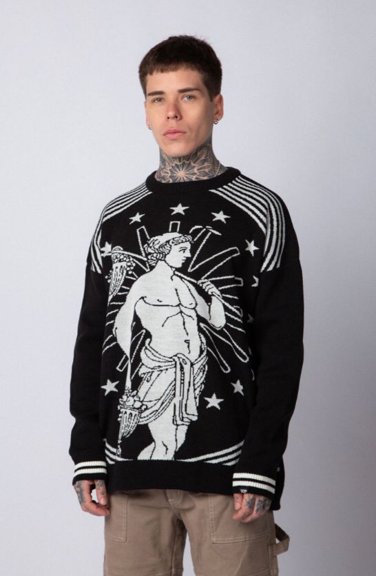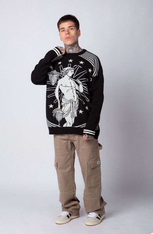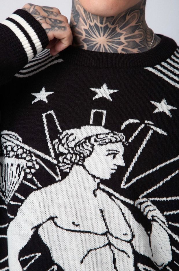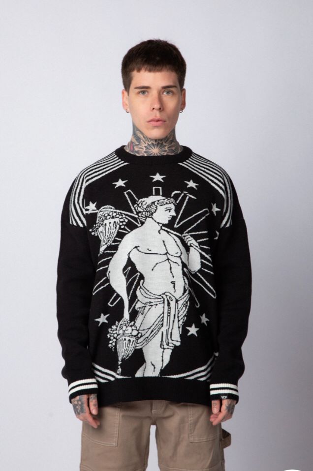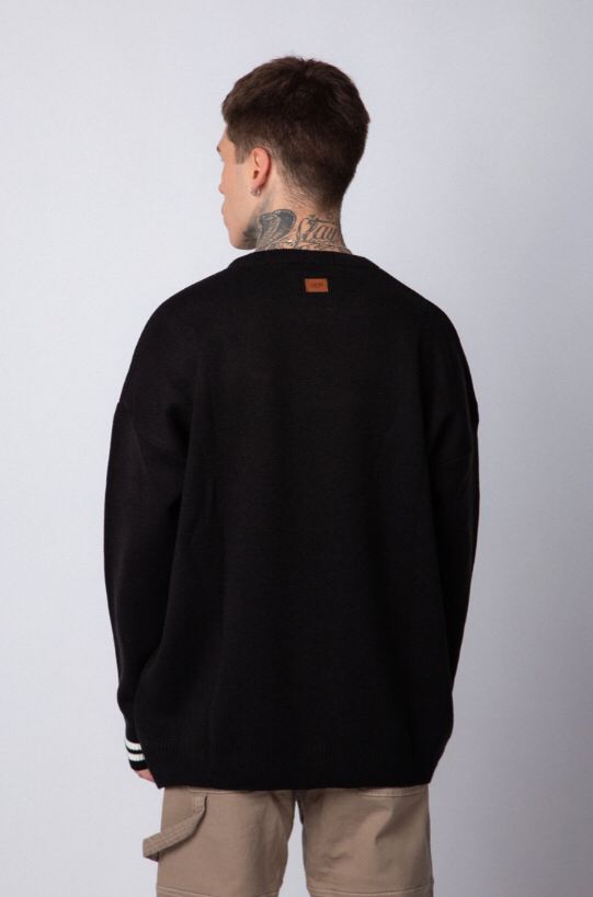 Sweater cuello redondo- tela hilo. Tejido grueso. Corte oversize. Con motivo.