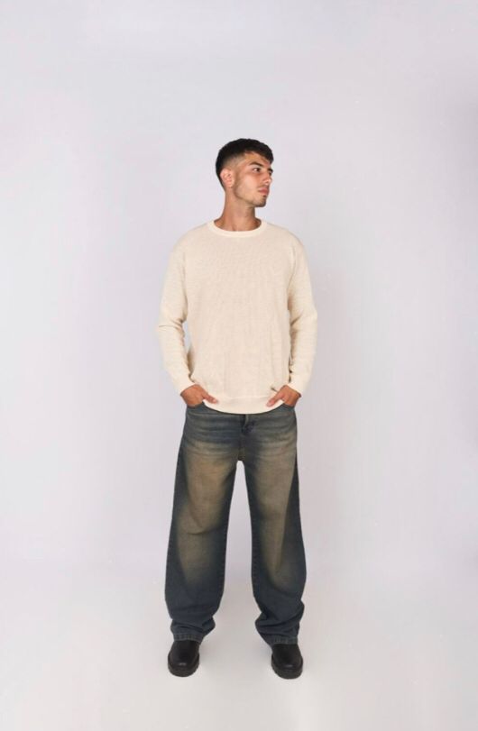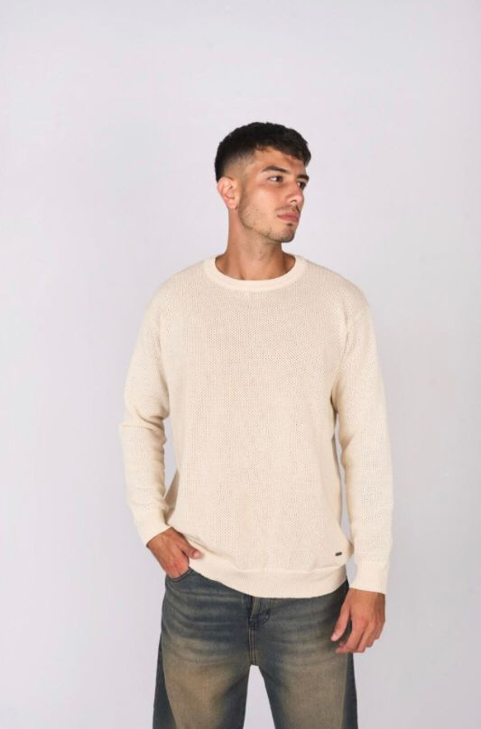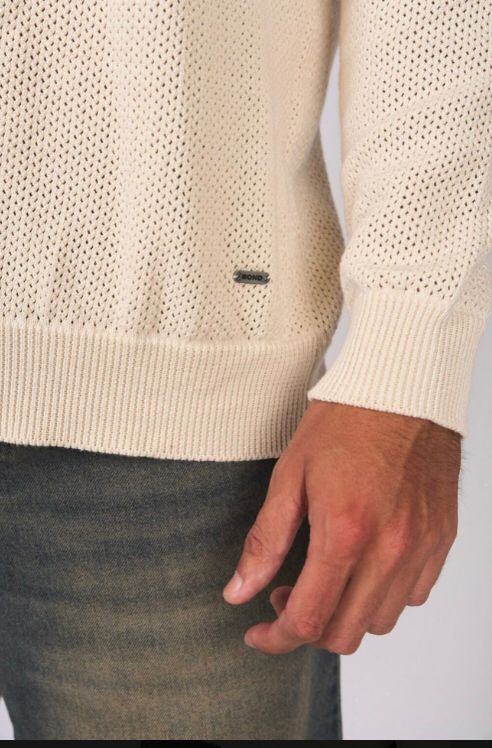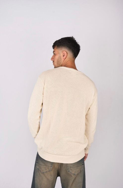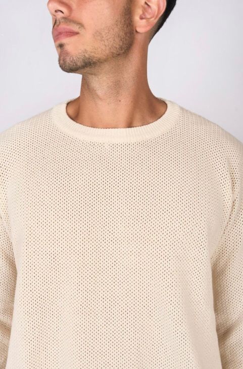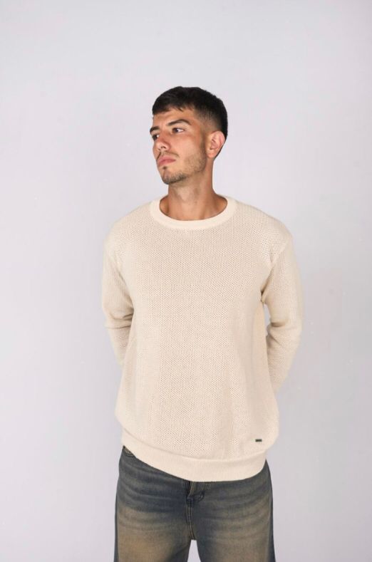 Tejido con hilado premium, en punto calado. Tiene cuello, puños y cintura tejidos en rib. Avio cosido a mano sobre lateral delantero derecho.